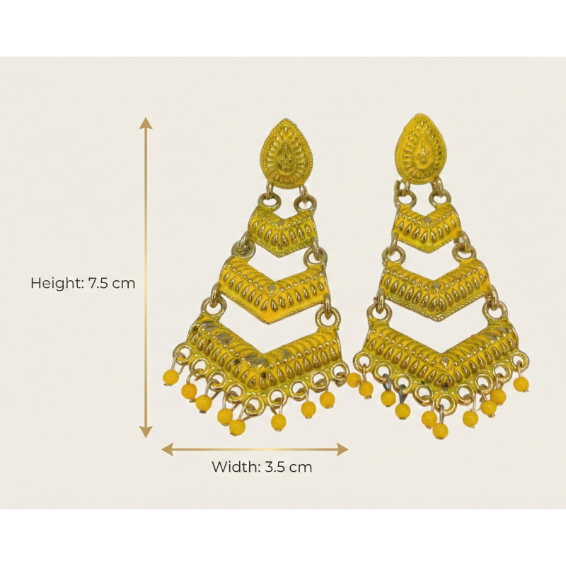Add timeless elegance to your ethnic wardrobe with these beautifully handcrafted Yellow meenakari layered earrings. Designed in a structured chevron pattern, these earrings feature intricate gold detailing and delicate pearl hangings that enhance their traditional appeal.