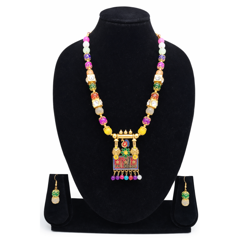 Handcrafted Multicolor Beaded Necklace Set with Traditional Pendant & Earrings